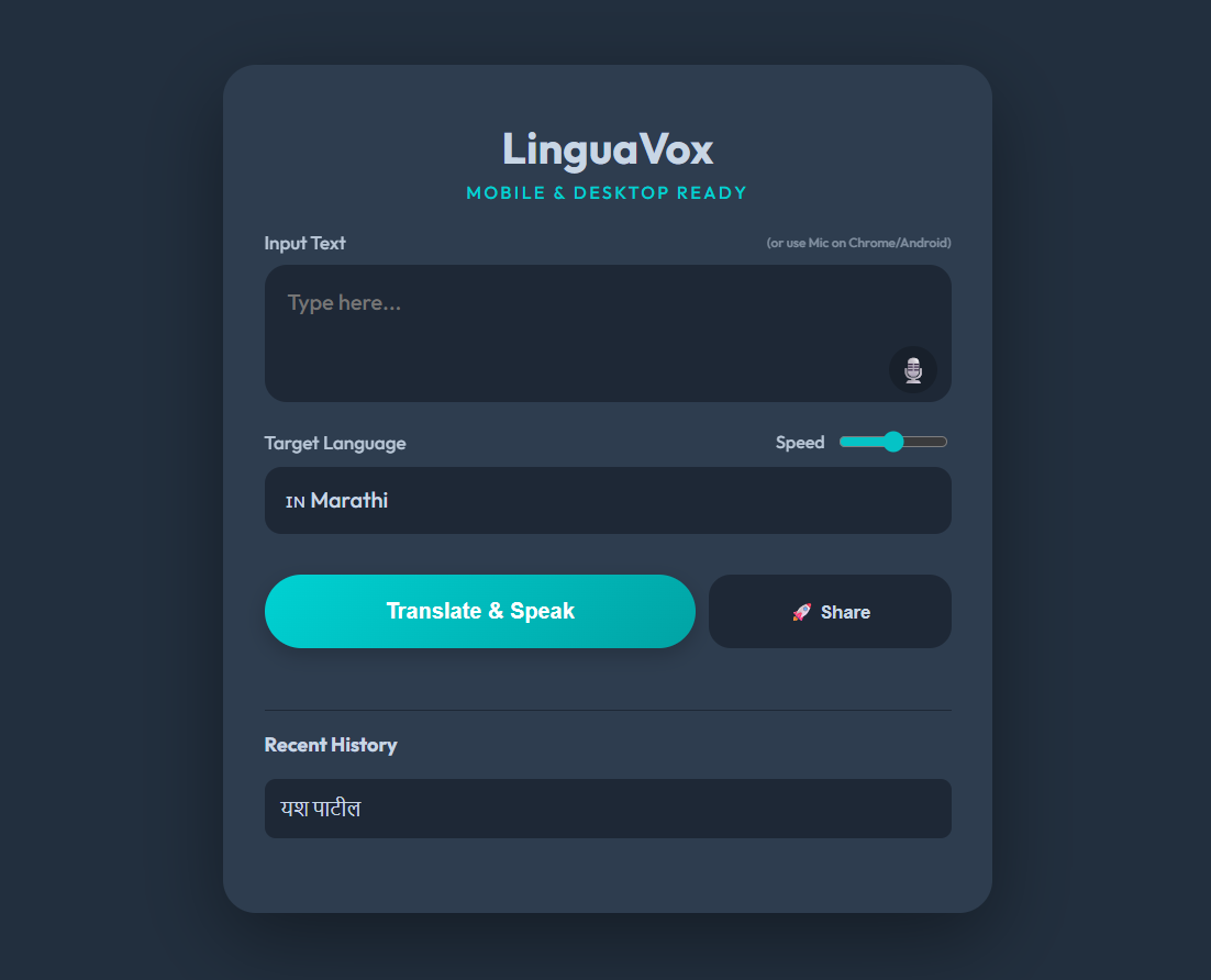 LinguaVox is a mobile-responsive web application that provides real-time translation, voice input, and text-to-speech synthesis across multiple languages.