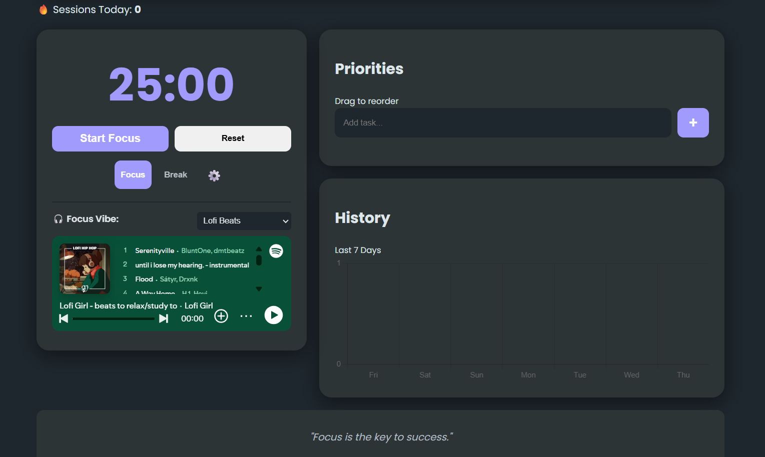 A gamified productivity dashboard combining a Pomodoro timer, drag-and-drop task management, and Spotify integration to maximize focus. It features real-time analytics and persistent data tracking to help users build consistent daily habits.